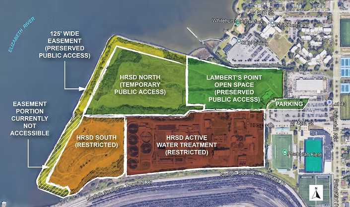 - In 2018, the City of Norfolk sold approximately 40 acres of the former Lambert’s Point Golf Course to Hampton Roads Sanitation District (HRSD). The purchase agreement between the City of Norfolk and HRSD established a 125 foot-wide easement around the perimeter of the HRSD parcel, which provides public access to shoreline along the Elizabeth River.